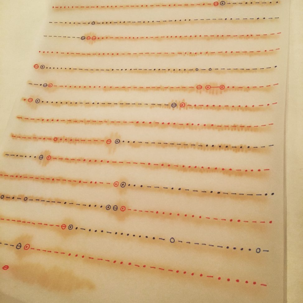 Using predominately Luis’s second interpretation, I created the second for COHERE | DISPERSE using  pen and transparent paper. I named it Ebb & Flow because while I was mapping Luis’s performance, the shapes in my drafts reminded me of the inward and outward movements of the sea. Later, I completely flattened my shapes out, reducing them to simple dots and lines depending on whether the note was higher or lower in pitch than the previous. After finishing, the name still stuck with me. So here it is. Ebb & Flow.